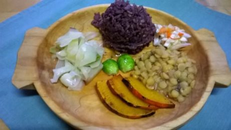 Tenhle recept jsme si uvařili k večeři. Poskládali jsme pestrý zimní talíř vyvážením všech podstatných složek. Obiloviny zastupuje rýže: použila jsem rýži celozrnnou dlouhou spolu s trochou rýže černé. Černá rýže pouští barvu, a tak výsledná barva byla hezky nafialovělá. Do rýže jsem při vaření přidala ještě slunečnicová semínka. Bílkoviny zastupuje žlutý hrách namáčený přes noc. Vařila jsem ho...