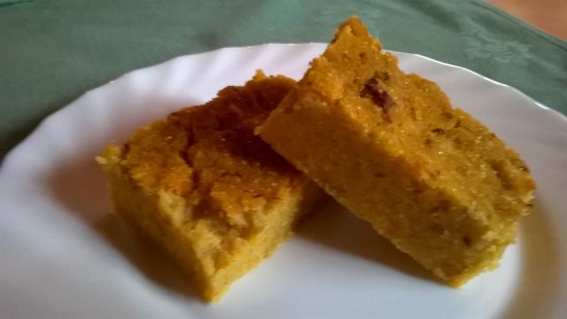 Hrušky nastrouháme na hrubo, předem uvaříme dýni a rozmačkáme ji vidličkou. Smícháme hrušky, uvařenou dýni, citronovou kůru (bio) kandovanou, maizenu, osladíme rýžovým sirupem a zahustíme kukuřičnou moukou a kukuřičnou krupicí, osolíme špetkou soli. Vypracujeme vláčnou směs, kterou rozložíme na pekáč. Pečeme v předem středně vyhřáté troubě přibližně 45 min.