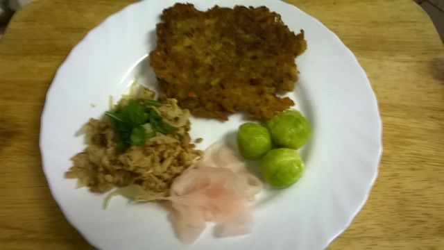 Nastrouháme dýni Hokkaido na hrubo (nebo klidně i na jemno), přidáme česnek, majoránku, sůl (nebo i shoyu) a mouku (kdo jakou chce: pšeničnou, špaldovou, pohankovou…). Směs ještě doplníme zeleninovým vývarem a řádně promícháme. Vytvoříme konzistenci hustého palačinkového těsta. Smažíme po obou stranách dozlatova. Do bramboráku můžeme zabalit směs z tempehu, kvašeného zelí a petrželové „slaněnky“ (to je na kousíčky nakrájená petržel a hodně osmažená, osolená). K tomuto jídlu se hodí napařená zelená zelenina (brokolice, kapustičky, nebo třeba zelí), kvašené zelí, nebo daikon, list salátu a zelená posypka.