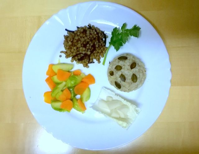 K večeři jsme si vymysleli něco lehčího, ale zároveň zimního – aby jídlo trochu zahřálo, ale neunavilo. Uvařila jsem celozrnnou kulatou rýži spolu s pohankou a sezamovým semínkem. Zelenou čočku jsem namáčela přes noc a vařila spolu s řasou Hijiki, ke konci varu jsem ji dochutila umeoctem a kořením Dátá kari. Mrkev jsem nakrájela na půlkolečka a kapustičky na čtvrtky. Zeleninu jsem dusila se solí a trochou sezamového oleje a ke konci varu jsem přidala šťávu z vymačkaného zázvoru. Pro osvěžení jsem na talíř položila kousek čínského zelí a na něj kvašku z černé ředkve. Bílá kvaška sice trochu splývá s talířem, ale je naše (ze zahrady). Talíř jsem dozdobila dýňovými semínky a snítkou celerové natě.